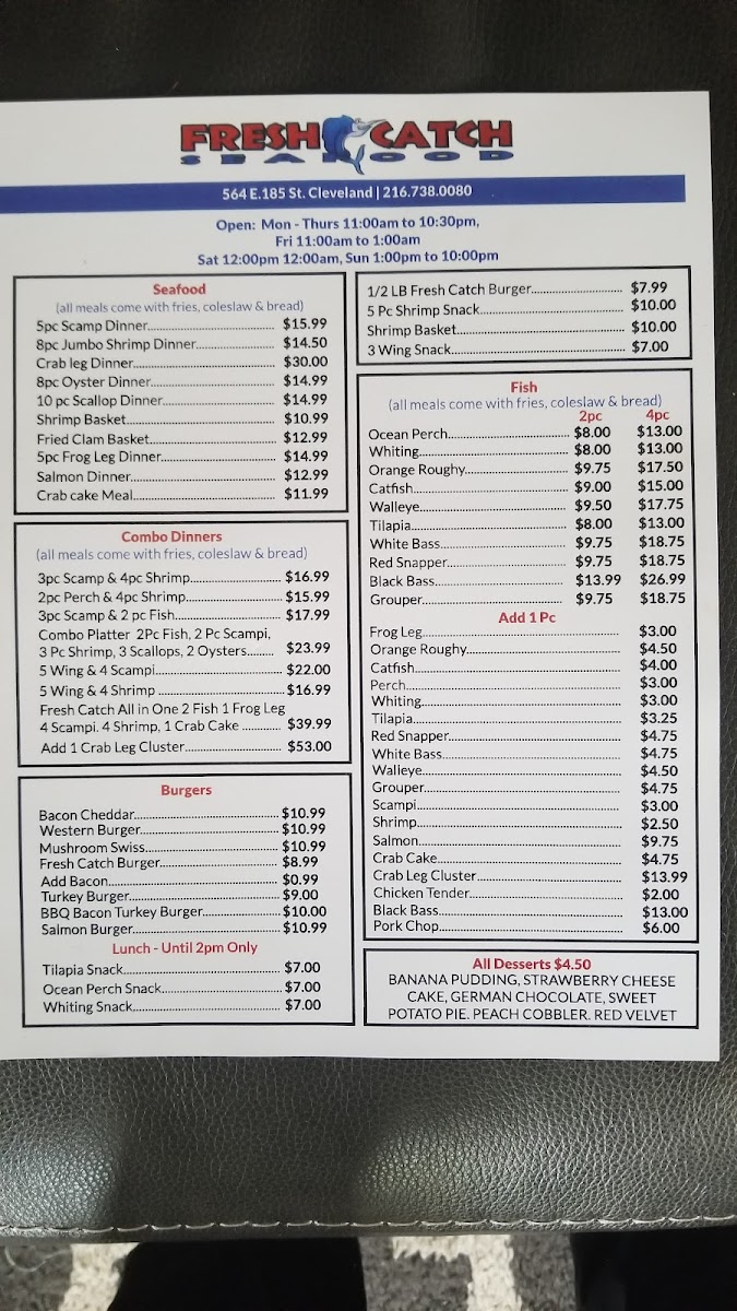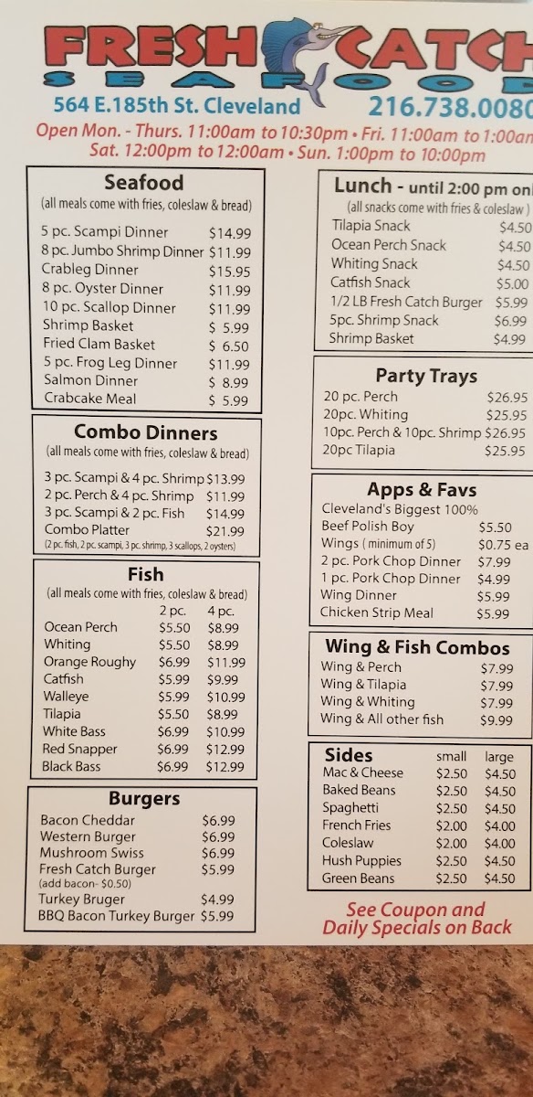 Welcome to Fresh Catch Seafood, a hidden gem located at 564 E 185th St, Cleveland, OH. Here, the menu celebrates the vibrant flavors of freshly caught seafood, enticing diners with an array of options that are both delicious and reasonably priced. Customers rave about the perch and shrimp combo, complemented by seasoned fries that elevate the dining experience. The generous portions and daily specials make it a favorite among locals, earning it a reputation for being better than typical chains.